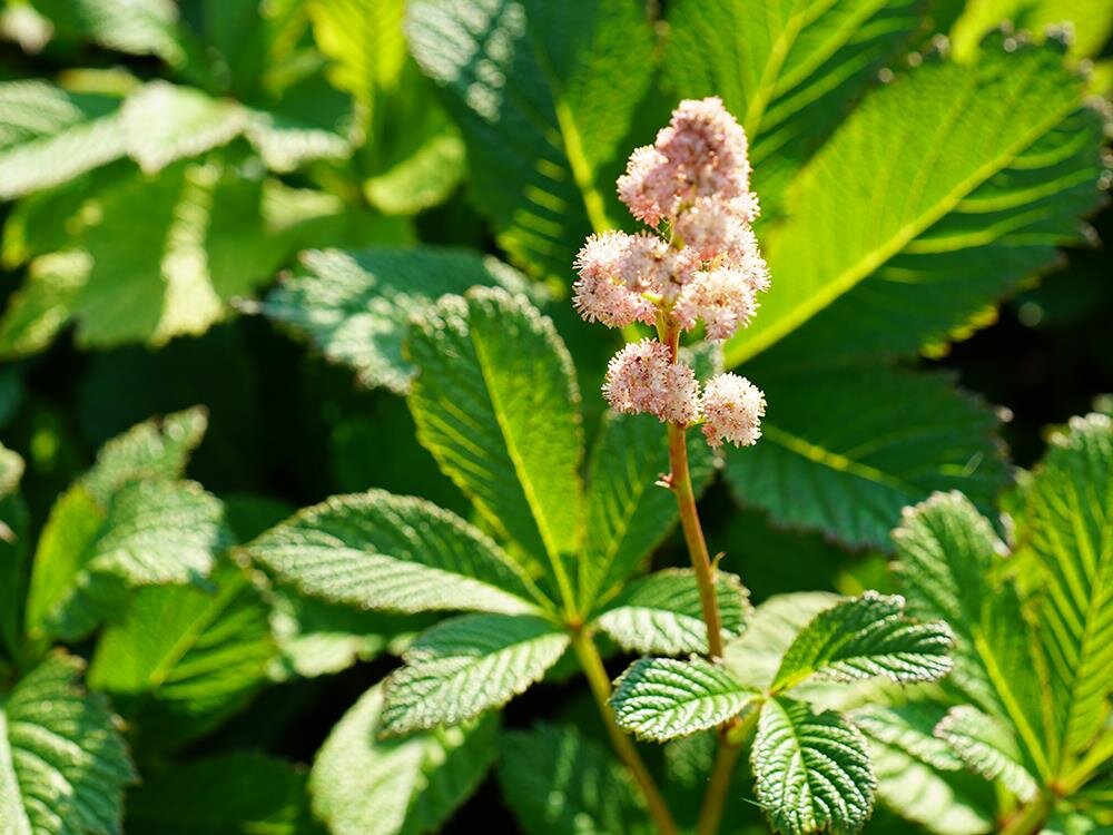 eine der wertvollen Pagels-Selektionen, dunkelgrünes festes Laub, im Austrieb bräunlich an den Spitzen, was sehr apart wirkt. Sehr harmonischer Blütenstand. Rodgersien sind üppige Blattschmuckstauden für schattige, gut versorgte Standorte, die vor Spätfrösten geschützt liegen
